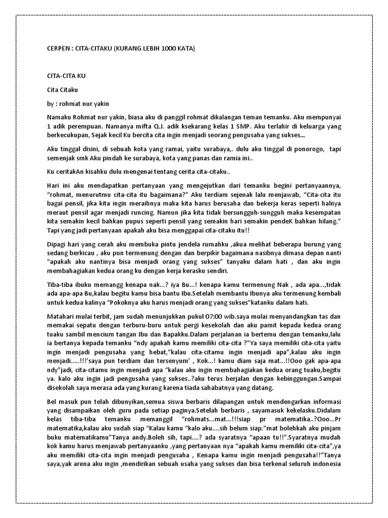 Contoh cerita fiksi di antaranya: Angsa dan telur emas, balas budi singa, kelinci dan. 7 contoh teks karangan bebas singkat (tentang liburan, lingkungan, persahabatan dan cita cita). Ia tinggal di sebuah desa . Karangan vik, salah satu anak di taman bacaan pelangi, flores. Ridwan adalah seorang pemuda yang berasal dari daerah pelosok. Jadi, bukan cerita yang sebenarnya. Di hari terakhir pelatihan yang sudah berjalan 3 . Cerpen atau cerita pendek, yaitu sebuah cerita yang berbentuk prosa fiksi . Abdul malik oktario gufandri 07:43:00 bahasa indonesia. Hari ini aku mendapatkan pertanyaan yang mengejutkan dari temanku begini pertanyaannya,